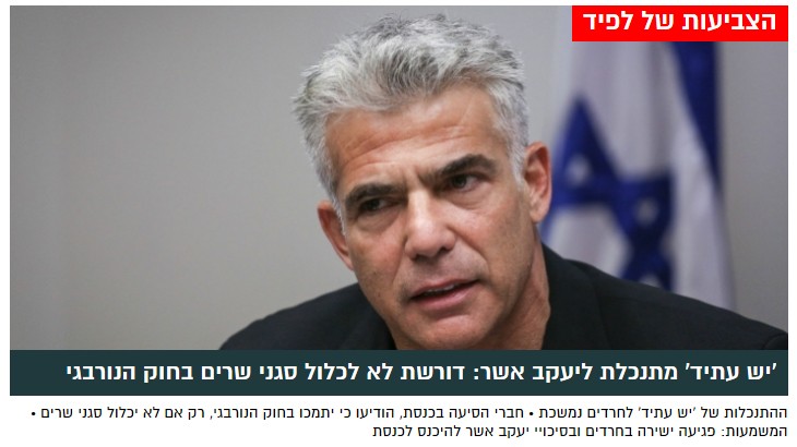 'יש עתיד' מתנכלת ליעקב אשר: דורשת לא לכלול סגני שרים בחוק הנורבגיההתנכלות של 'יש עתיד' לחרדים נמשכת • חברי הסיעה בכנסת, הודיעו כי יתמכו בחוק הנורבגי, רק אם לא יכלול סגני שרים • המשמעות: פגיעה ישירה בחרדים ובסיכויי יעקב אשר להיכנס לכנסת