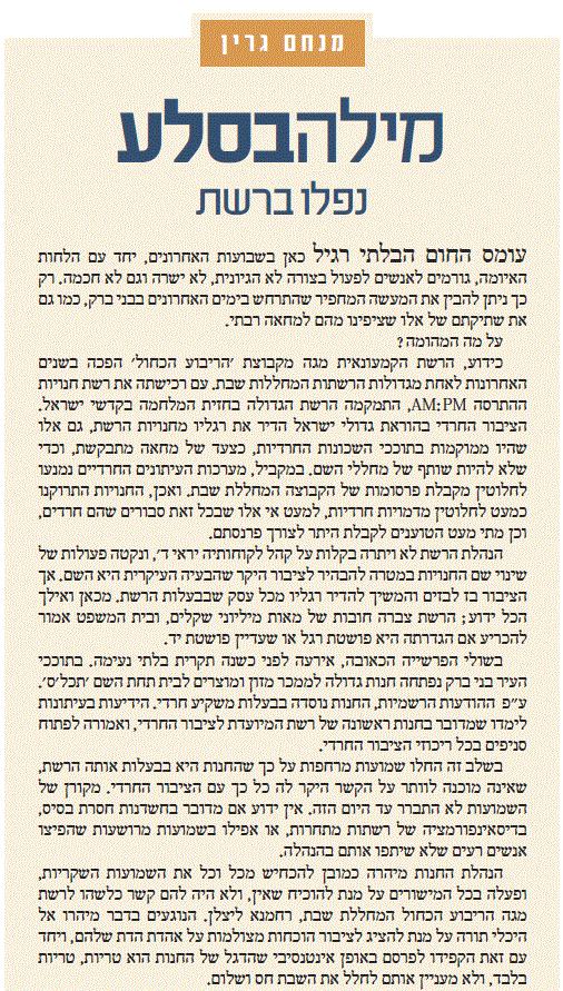 כמה משעשע לחשוב איך קוראים את זה 'המבינים בעם' ומלקקים את שפתותיהם הנה שוב נתנו להם בשינים. הבעיה שלהם היא שהזגוגיות שלהם כה כהות שהם לא מצליחים לראות שאף אחד, אבל אף אחד,חוץ מאותה חלטורה משעשעת שדנה על הדברים במטבחי מעלות התורה המהבילים, אף אחד אבל אף אחד לא ראה לא שמע לא קרא לא ידע, המילים נכתבו, החיוכים על פניהם של אונה ווין נמרחו, אבל אף אחד אף אחד אף אחד לא ראה לא שמע לא ידע לא קרא לא יקרא, פשוט כלום! לחשוב לה איך תהילת עולם חולפת, נתי אתמול כוווולם דשו דנו בדבריך, והיום אף אחד אף אחד אבל אף אחד, לא יודע לא קורא לא שומע לא רואה. מילה בסלע. |