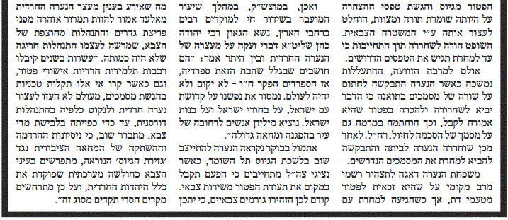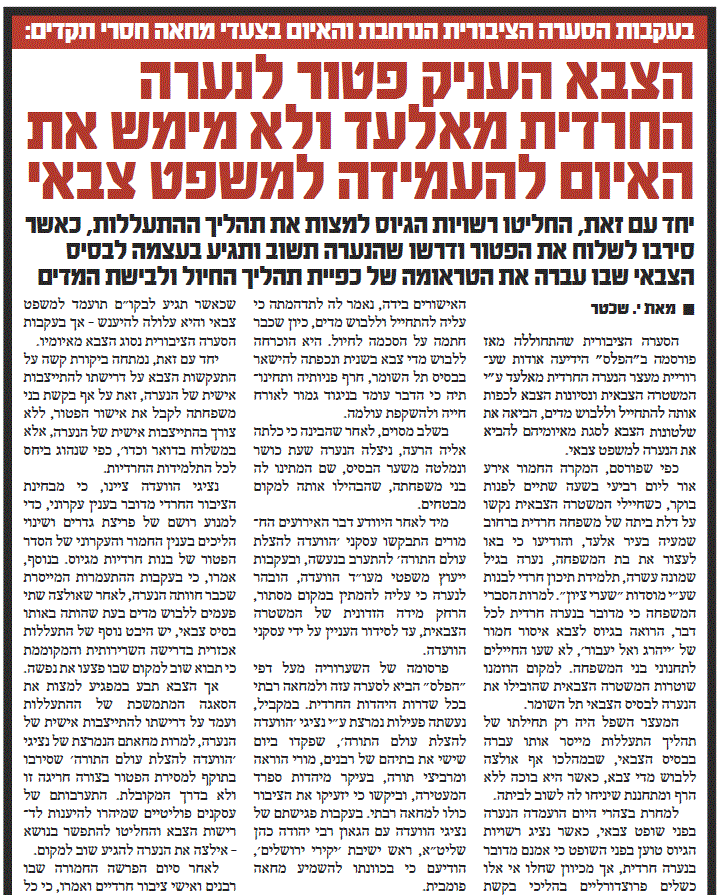 3. בעקבות הסערה הצבורית העזה, שלטונות הצבא התקפלו והעניקו פטור לנערה החרדית