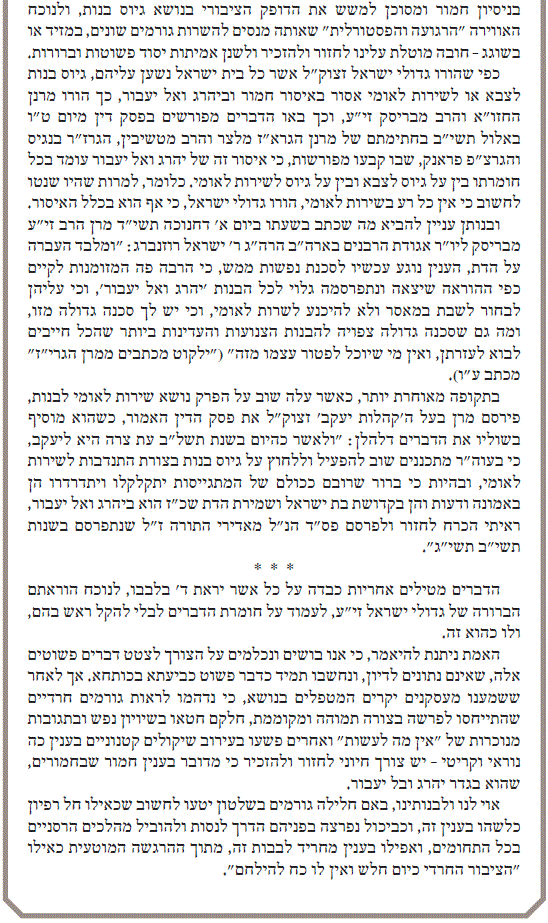 "אוי לנו ולבנותינו, באם חלילה גורמים בשלטון יטעו לחשוב שכאילו חל רפיון כלשהו בענין זה, וכביכול נפרצה בפניהם הדרך לנסות ולהוביל מהלכים הרסניים בכל התחומים, ואפילו בענין מחריד לבבות זה, מתוך ההרגשה המוטעית כאילו "הציבור החרדי כיום חלש ואין לו כח להילחם".