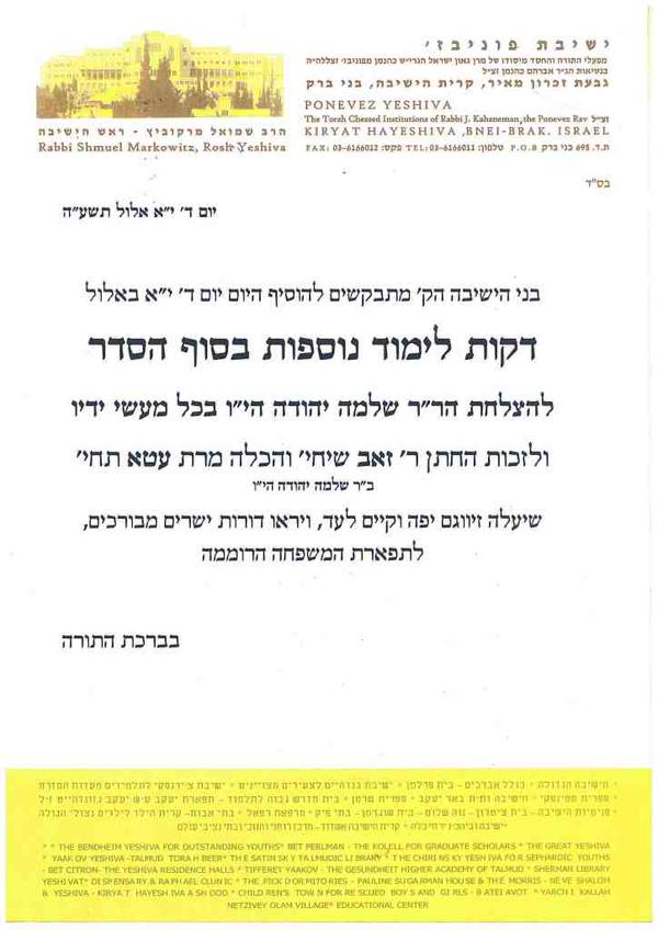 מזל טוב וברכות עד בלי די לנדיב המפואר ר' שלמה רכניץ מLA שתומך ומסייע בעולם התורה ומסייע לבני תורה בכל יכלתו (למרות אי אלו אנשי חצרו שמנסים לטרפד כל העת את תמיכתו בכאלו הנמנים על בני התורה, לא עלתה בידם מאומה)