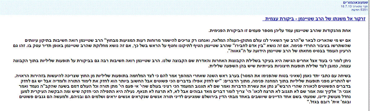 'ביקורת עצמית' במשנתו של הרב שטיינמן