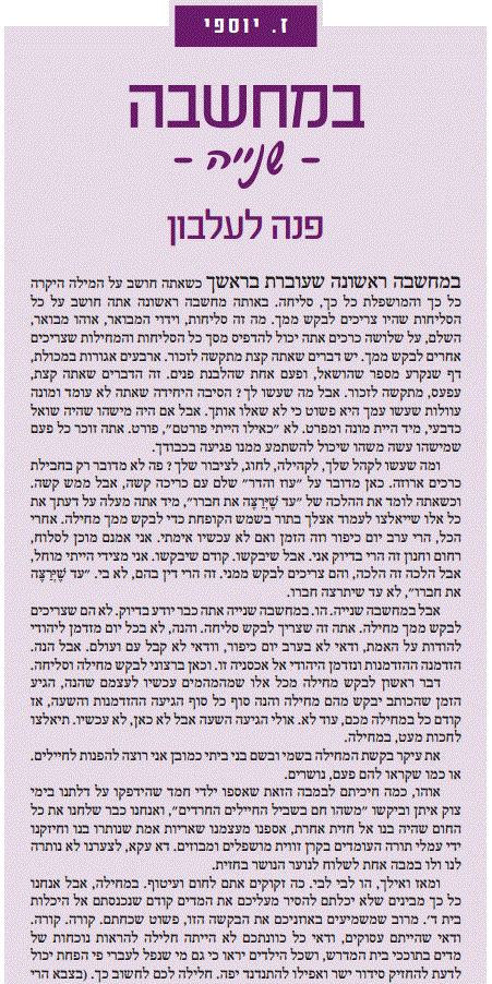 ''הפלס'' בטור משעשע של בקשת סליחה מהחייל 'החרדי' הפגוע, האומלל והמסכן מילה בסלע 18.09.15 17:00 כותרת