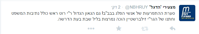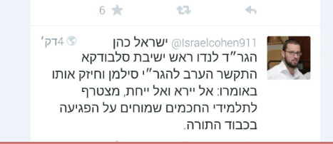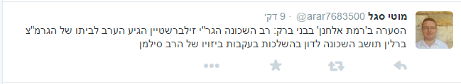 ''שבוע טוב חברי הקבוצה היקרים! כידוע השבת היה 'שבת שובה' ובשבת זו נהוג לדרוש דרשה מפי רבנים וגאונים, ובשכונת רמת אלחנן נמסרה דרשה בליל שבת מפי הגאון הגדול הרב יהודה סילמן שליט''א (יש לציון שאני נוכחתי במקום), והגיע הרגע והזדעזעתי כאשר אני שומע בחורים מפלוגת ''בני תורה'' (מפלגת 'עץ' בראשות הרב שמואל אוירבך) כביכול זה שם המפלגה פורצים אל תוך בית המדרש כמובן בשעת דרשתו של מורנו הרב סילמן וצעקו ''סילמן רוצח, סילמן רוצח'' הרב בונים זילברברג שגר מול הבית כנסת ישב בביתו ושמע את צעקות הנערי שוליים וירד לכיון בית המדרש וכשהגיע לבית המדרש ראה את הנעשה והורה להפסיק את הדרשה ולמחות שם שמים.