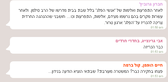 זעם ברמת אלחנן: בחורי 'הפלג' התפרעו בשבת קבוצת פרחחים המזוהה עם 'הפלג הירושלמי' הפריעה לדרשת הגר''י סילמן וסולקה על ידי רבני השכונה ותושביהאלי כהן שבת ו' תשרי תשע''ו 20:24 19/09/2015 הגר''י סילמן נשא את דרשת שבת שובה בשעה 22:00 בליל שבת בבית הכנסת המרכזי של רמת אלחנן בקומה העליונה. כאשר למקום הגיעו יותר מ-200 אברכים מתושבי השכונה שהשתתפו בדרשה.