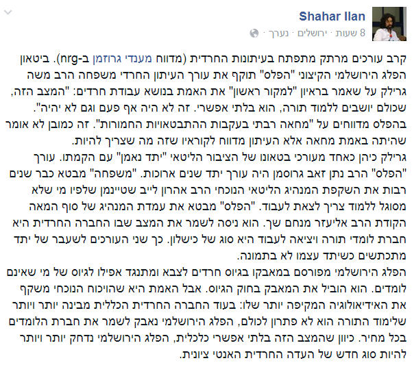 ביטאון הפלג הירושלמי הקיצוני ''הפלס'' תוקף את עורך העיתון החרדי משפחה הרב משה גרילק על שאמר בראיון ''למקור ראשון'' את האמת בנושא עבודת חרדים: ''המצב הזה, שכולם יושבים ללמוד תורה, הוא בלתי אפשרי. זה לא היה אף פעם וגם לא יהיה''. בהפלס מדווחים על ''מחאה רבתי בעקבות ההתבטאויות החמורות''. זה כמובן לא אומר שהיתה באמת מחאה אלא העיתון מדווח לקוראיו שזה מה שצריך להיות.