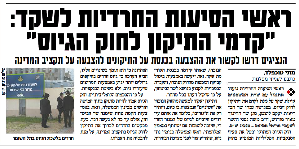 הנציגים דרשו לקשור את ההצבעה בכנסת על התיקונים להצבעה על תקציב המדינה ראשי הסיעות החרדיות נועדו אתמול עם שרת המשפטים איילת שקד על מנת לקדם את התיקון לחוק הגיוס. בפגישה נכחו שר הבריאות יעקב ליצמן, סגן שר החינוך מאיר פורוש, ח''כ משה גפני והשר לשעבר אריאל אטיאס - כנציג ש''ס.