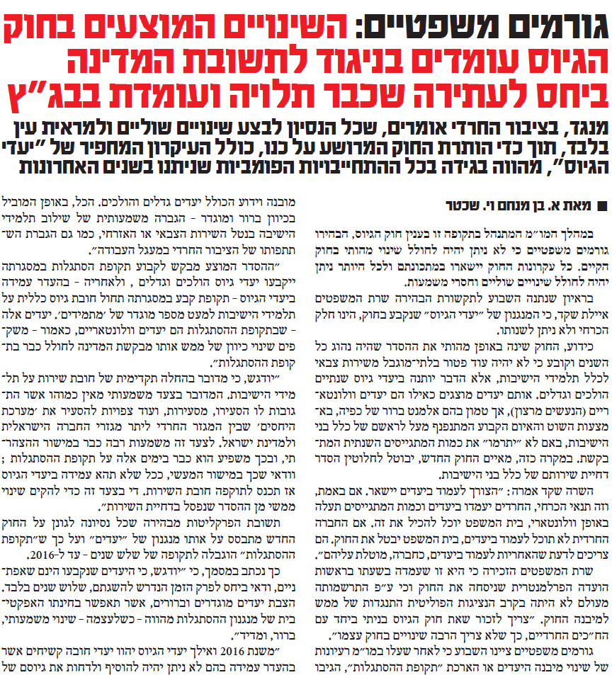 בשעות הלילה הפיץ משרד הביטחון את תזכיר חוק הגיוס החדש ממנו עולה כי תקופת ההסתגלות תוארך על פי החוק החדש עד 2023.