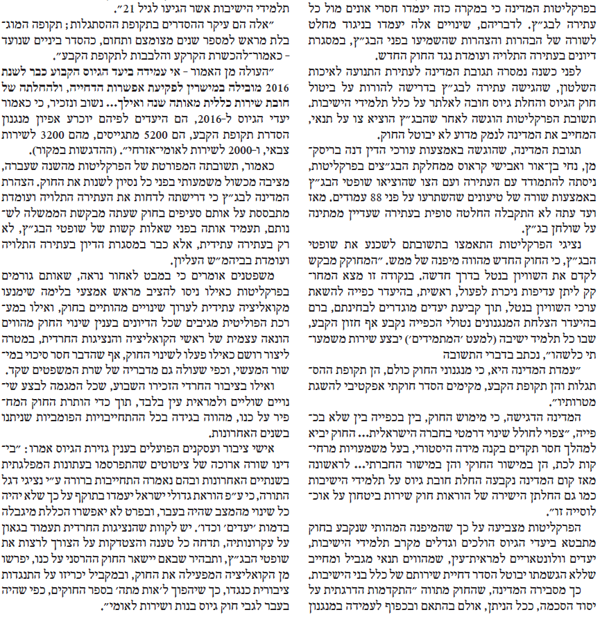 חוק הגיוס: עד 2023, הסנקציות הפליליות ייקבעו ע''פ שיקולי שר הבטחון בהתאם למילוי יעדי הגיוס ע''י החרדיםמשרד הביטחון הפיץ במהלך הלילה את תזכיר חוק הגיוס החדש ממנו עולה כי תקופת ההסתגלות תוארך על פי החוק החדש עד 2023. הבשורה: לא יהיו סנקציות פליליות (אקטואליה)