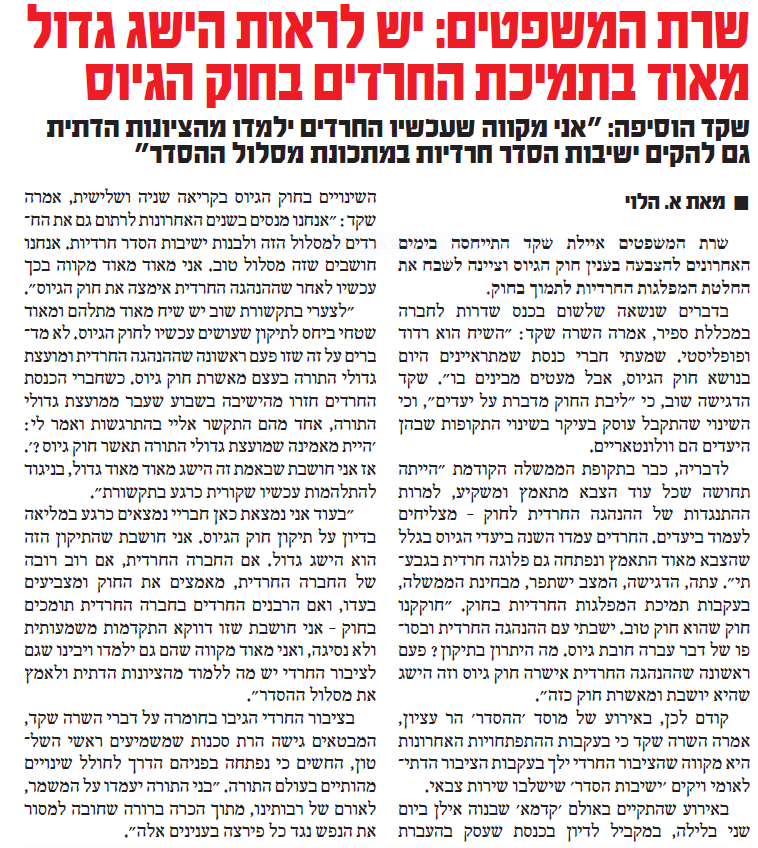 ''אנחנו מנסים בשנים האחרונות לרתום גם את החרדים למסלול הזה ולבנות ישיבות הסדר חרדיות'', חשפה שקד, ''אנחנו חושבים שזה מסלול טוב, יש כבר כמה כאלה בודדות, אבל אני מאוד מאוד מקווה שעכשיו משההנהגה החרדית אימצה את חוק הגיוס ולצערי בתקשורת שוב יש שיח מאוד מתלהם ומאוד שטחי ביחס לתיקון שעושים עכשיו לחוק הגיוס - לא מדברים על זה שזה פעם ראשונה שההנהגה החרדית ומועצת גדולי התורה בעצם מאשרת חוק גיוס''. השרה שקד המשיכה וסיפרה כי