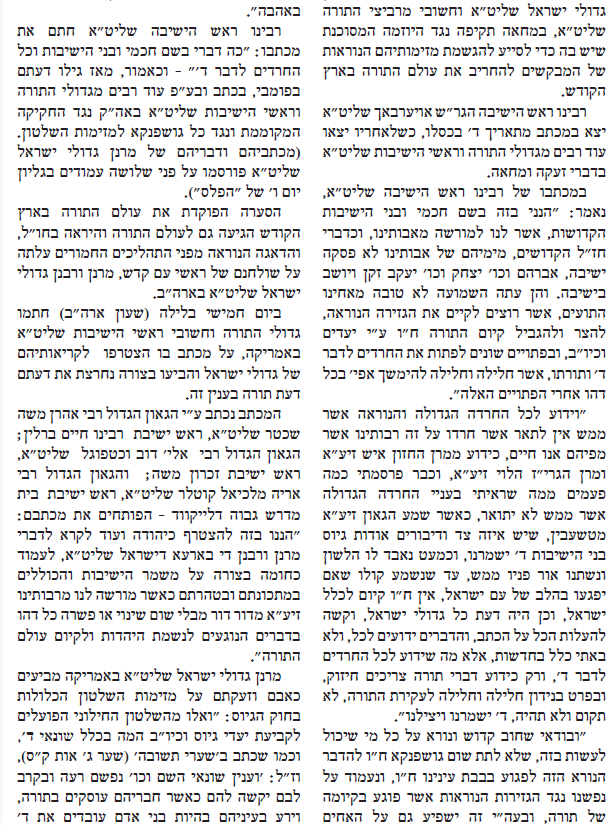 מאבק הפלג הירושלמי / ראשי ישיבות בארה''ב נגד תיקון חוק הגיוס: ''רוחות זרות''שלושה מגדולי ראשי הישיבות בארה''ב, הגאון רבי אהרון שכטר, הגאון רבי אליהו דוב וכטפוגל והגאון רבי אריה מלכיאל קוטלר מפרסמים מכתב בעיתון ''הפלס'' בו הם מביעים התנגדות לתיקון חוק הגיוס (חרדים)
