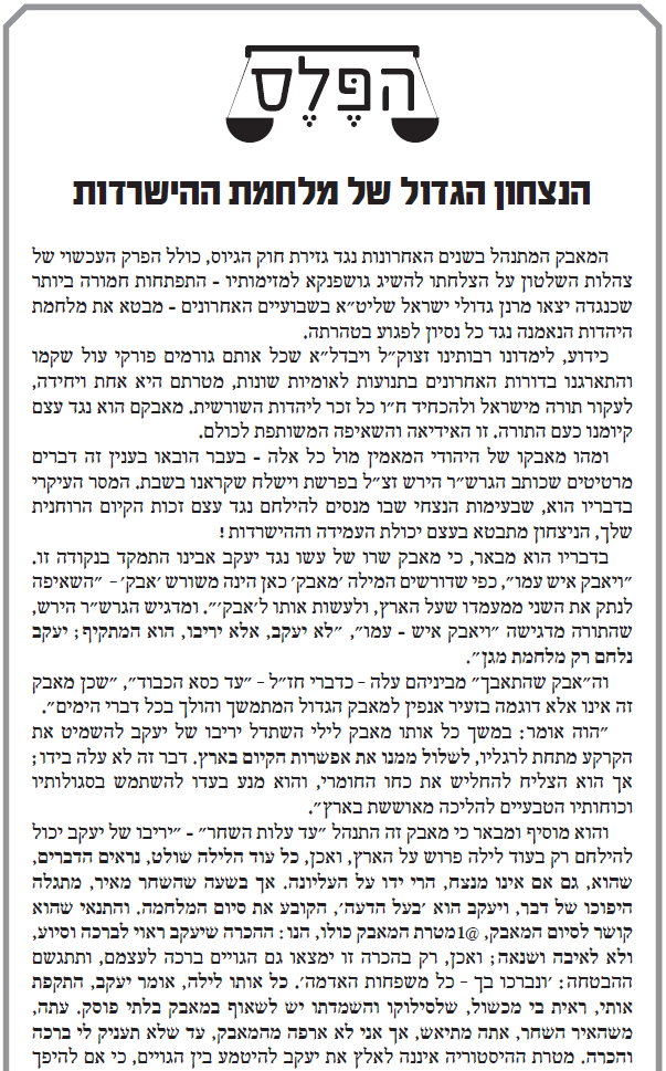 ובזכות עמידתנו האיתנה על משמר התורה בטהרתה, יגן השי''ת על עמו ארצו ונחלתו, וישיב ה' שבות יעקב, ומלאה הארץ דעה את ה' בב''א.