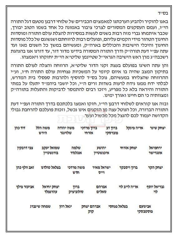 במכתבם הם כותבים: ''באנו להוקיר ולהביע הערכתנו למאמצים הכבירים של שלוחי דרבנן מטעם דגל התורה הי''ו, ועמם העסקנים המסורים לצרכי ציבור באמונה כל אחד בשמו הטוב יבורך, שכבר איתמחו גברי מזה רבות בשנים לעשות במסירות להצלת עולם התורה ומוסדות החינוך הטהור מידי הקמים עליהם, ופועלים רבות לרווחתם ושגשוגם של כלל מוסדות החינוך והיכלי הישיבות והכוללים בארה''ק, ומעשיהם במשך כל השנים מאז ועד עתה עפ''י דעת תורה''ק ודרך התורה המסורה בידינו מדור דור, עד דורנו אנו בהנהגת רשכבה''ג מרן ראש הישיבה הגראי''ל שטיינמן שליט''א הי''ת יחזקהו ויאמצהו.
