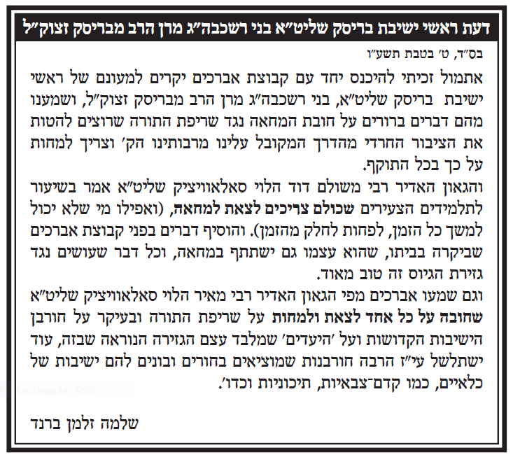 מרנן ורבנן גדוה''ת ראשי ישיבות בריסק בהוראה ברורה: החובה על כולם לצאת למחאה