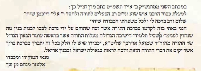 יש עוד מכתבים - ע''כ אומר כל כדין סמוכי לנא כי חכם הוא וממלכי דרבנן הוא וע''כ לביש מדא הוא ויורה וידין בכל חדרי תורה ואורחות תורת החיים יהנו ויחכמו רבים לאורו כי טוב, ישכימו לפתחו וישחרו פניו ויטעמו מצוף נועם תורתו ועצה עמוקה יטלו ממנו וישכילו ויצליחו בכל דרכיהם.