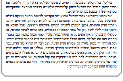 בהסתמך על המכתבים שהציג, קובע העיתון כי חה''כ מרגי פועל במפורש נגד דעת תורתם של גדולי הדור הספרדים ובראשם מרן הגר''ע יוסף ויבדלחט''א נשיא מועצת החכמים מרן הגר''ש כהן שליט''א, ולפי הצעת חוק זו ייאסר פרסום מכתביהם אלו.