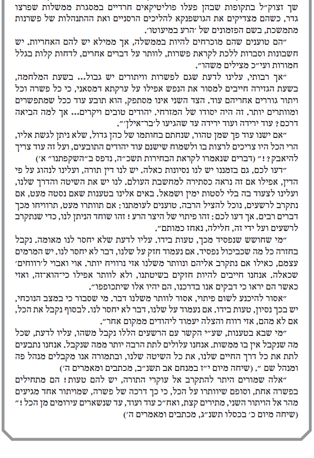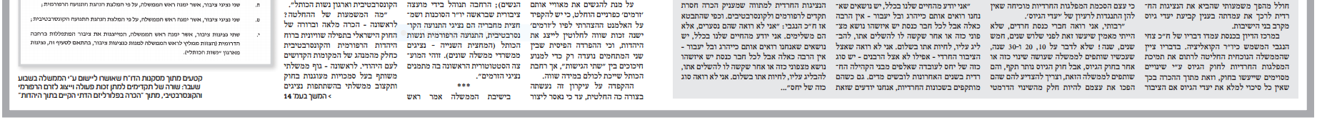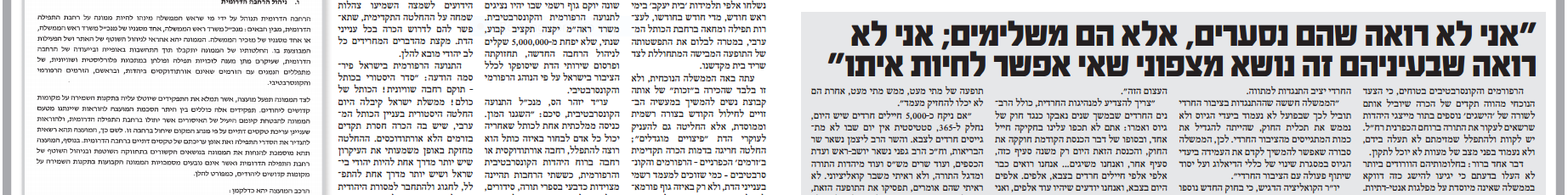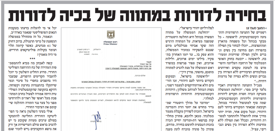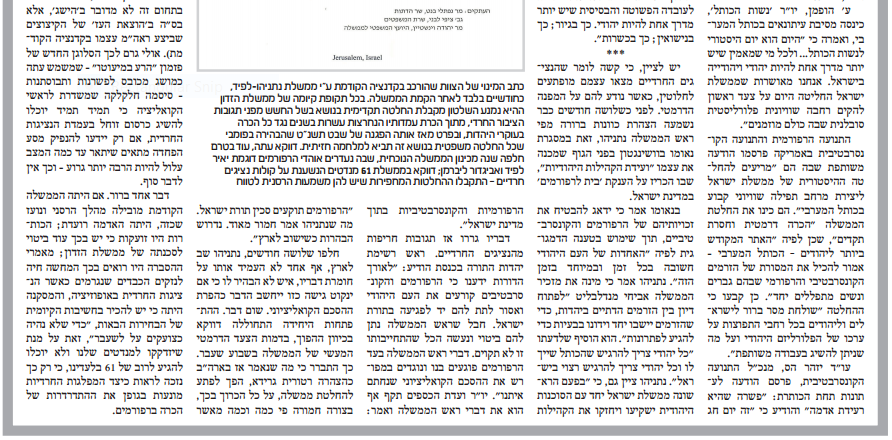 ''אנו עדים אפוא לתהליך מסחרר של כרסום מהיר ודינמיקה מסוכנת. וכאמור, ההחלטה חסרת התקדים בעניין רחבת הכותל המערבי, על כל שלל הפרצות המקוממות של הכרה מוצהרת ופומבית באותם ''זרמים'' הורסי היהדות, התקבלה דווקא בממשלה התלויה ועומדת בכל רגע בקולות הנציגות החרדית''.