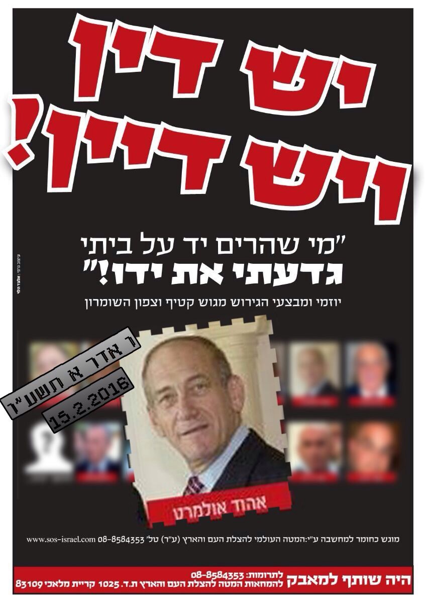 ערב כניסת אהוד אולמרט לכלא מפיצים פעילי המטה להצלת הארץ כרוזים יש דין ויש דיין עם תמונת אולמרט ומציינים את חלקו בתוכנית ההינתקות תוך ציטוט של השופט חשין מי שהרים יד על ביתי גדעתי את ידו. במטה להצלת העם והארץ מציינים שתוכנית ההינתקות בקריאה שניה ושלישית התקבלה בדיוק לפני 11 שנה בתאריך 15/2/2005 ז' באדר א תשס''ה. מבחינתנו זה סגירת מעגל מוסיפים במטה להצלת העם והארץ.http://rotter.net/forum/scoops1/288675.shtml#8