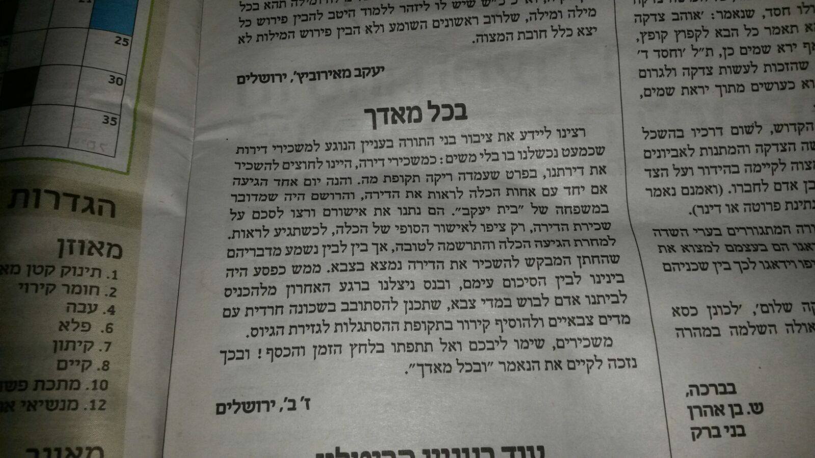 כותב המכתב הנ''ל, רואה בדיוק כך את פני הדברים.
