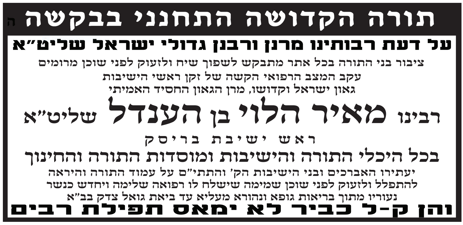 הציבור נקרא להעתיר בתפילה לרפואתו של מרן הגאון רבי מאיר בן הענדל לרפואה שלמה בתוך שאר חולי עמו ישראל.