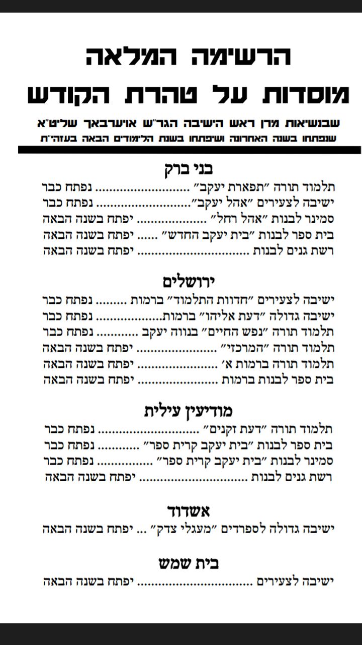 אשרינו שזכינו. הרשימה המלאה של מוסדות על טהרת הקודש.