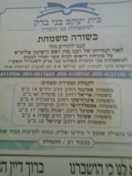 מודעת ב'הפלס' הבוקר על רישום ל'בית יעקב' 'אילתי' חדש בב''ב