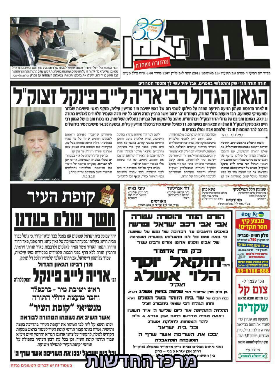 שער 'יתד נאמן' על פטירת מרן הגר''א פינקל זצוק''ל
