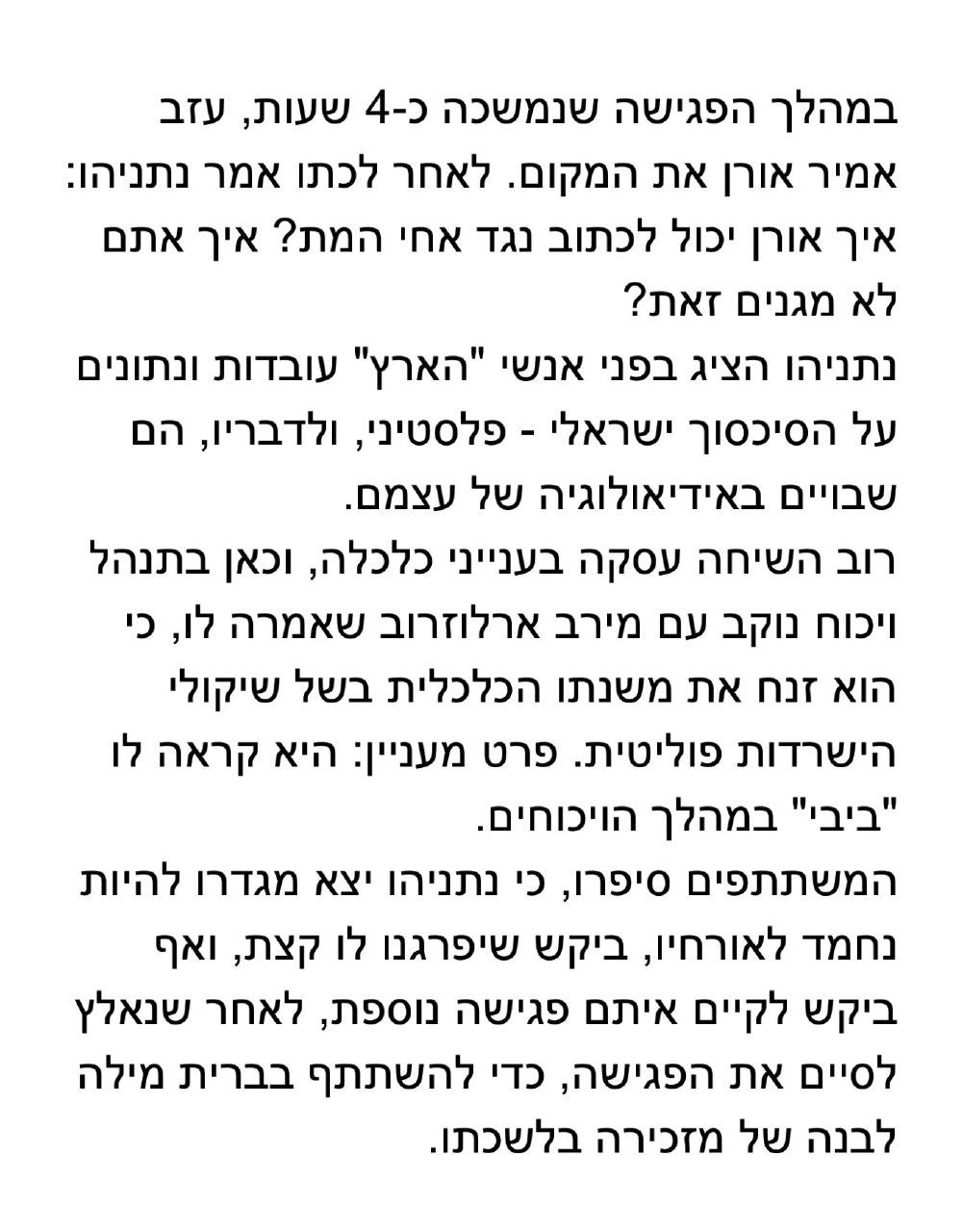 מסר נוסף עליו חזר במהלך סדרת הפגישות עם התקשורת שקיים, היה הרדיפה התקשורתית נגד אשתו, שרה נתניהו. ''היא קדושה. סורקים את בשרה במסרקות ברזל'', התבטא בחריפות.