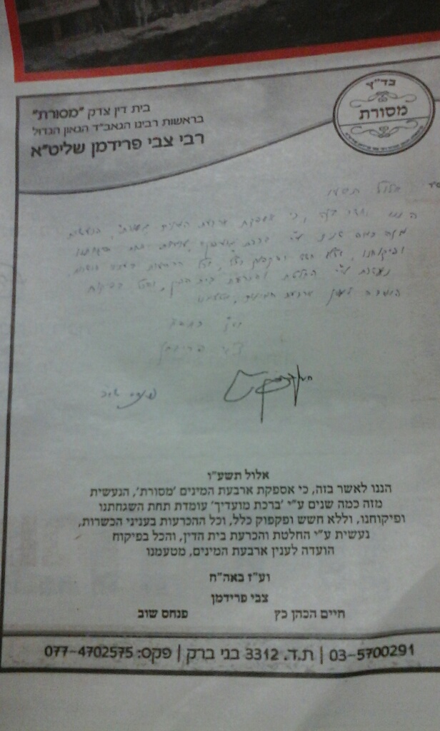 אולם לגבי כשרות ארבעת המינים יוצא הרב כץ במכתב עם שאר רבני בד''צ 'מסורת', שניתן להסתמך בזה בלבד!! על הכשרותנ.ב. מה שמעניין יותר שתמיד כשרב 'אילתי' היה עושה 'בעיות' מיד 'הפלס' ודובריו היו מכופפים אותו(כדוגמת הגר''ש מרקוביץ)