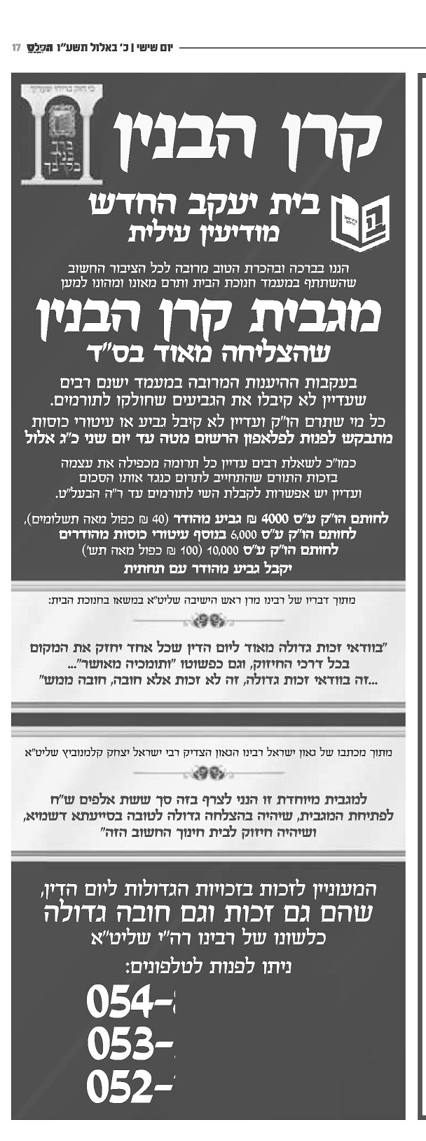 בימים אלו בפלג מנהלים מגבית רצינית ל'רכישת' מבנה ת''ת עמל התורה אותו סגרו, לטובת בית הספר לבנות 'על טהרת הקודש', כידוע את המבנה הם 'קונים' מהעסקן זילבר שהשתלט על החיידר, הסכום של 2.5 מליון אותו הם מגייסים מאנשיהם אינו מיועד עבור המבנה שנבנה על קרקע של הקצאה מתקציבי משרד החינוך, אלא מיועד עבור כיסוי חובות העמותה של 'עמל התורה' שנקלעה לקשיים כלכליים. את העמותה כולל המבנה העומד לרשותה, יקבלו מזילבר כאשר יכוסו חובות העמותה. מנהלי המגבית דורשים מכל אחד סכום של 4000-6000₪! לצורך זה.אמנם, עיריית מודיעין עילית נותנת למהלך לגיטמציה, למרות שהקצו לבית ספר העציצי הנ''ל שטח אחר, ולמרות שיש בעיה חוקית עם הקצאת מבנה של משרד החינוך למוסד שאינו מוכר ואינו מתוקצב ע''י משרד החינוך, מאחר וכעת אין מוסד אחר שצריך את המבנה, וראשי העירייה חוששים כנראה מקמפיין 'רדיפות' של הפלג (כפי שעשו בעבר עת גזלו שטח עבור סמינר ליקוטי עצות של הגב' שוב), אולם ברור לכל שלו ימצא אדם אחד בודד שיקום וירים טלפון לממונה על כך במשרד החינוך, באותו רגע כל המהלך יורד לטמיון והתורמים הניחו כספם על קרן הצבי!!