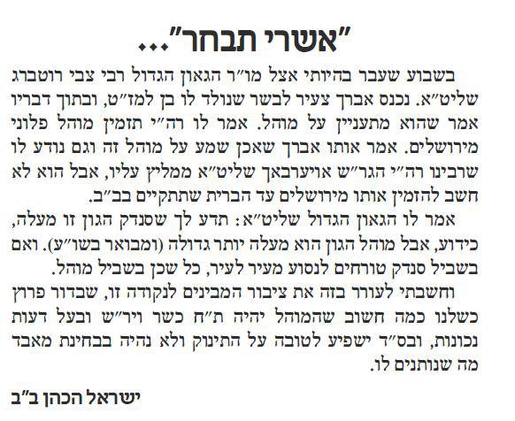 ''אשרי תבחר''... בשבוע שעבר בהיותי אצל מו''ר הגאון הגדול רבי צבי רוטברג שליט''א. נכנס אברך צעיר לשאול בעניין מנהג כפרות, ובתוך דבריו אמר שמתעניין על מסובב הכפרות. אמר לו רה''י תזמין מסובב פלוני מירושלים. אמר אותו אברך שאכן שמע על מסובב זה וגם נודע לו שנתמחה גם במשיכה, אבל הוא לא חשב להזמין אותו מירושלים עד הכפרות שיתקיימו בבני ברק. אמר לו הגאון הגדול שליט''א: תדע לך שתרנגול הגון זה מעלה, כידוע, אבל מסובב הגון הוא מעלה יותר גדולה (ומבואר באום אני חומה). ואם בשביל סוס או תרנגול טורחים לנסוע מעיר לעיר, כל שכן בשביל מסובב. וחשבתי לעורר בזה את הציבור המבינים לנקודה זו, שבדור פרוץ כשלנו כמה חשוב שהמסובב יהיה ת''ח כשר ויר''ש ובעל דעות נכונות, ובס''ד ישפיע לטובה על המסתובב ולא נהיה בבחינת מאבד מה שמסובבים לו. ישראל הכהן ב''ב |