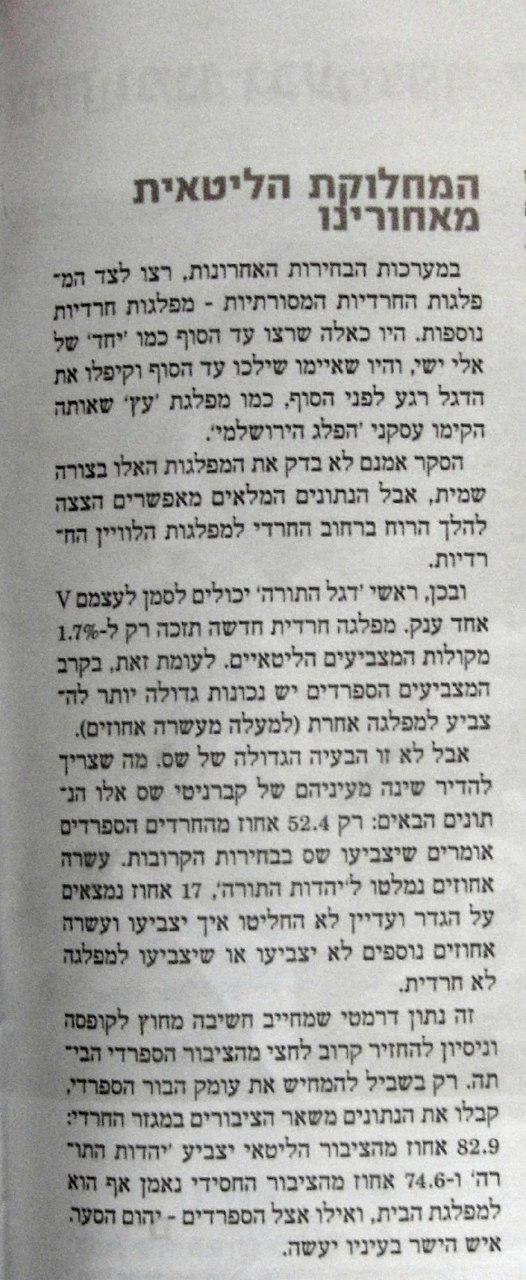 סקר מינה צמח ועיתון משפחה: 'הפלג' שווה כ1.7 % מהציבור הליטאי