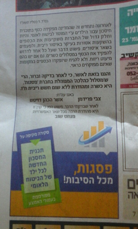 ביום שישי התפרסמה ב'הפלס' מודעת רבניהם הגר''צ פרידמן והגר''א דויטש התומכים בקרן 'מסלול כהלכה' של 'פסגות', ובעמודי האמצע התפרסמו מדעות פרסום של המסלול (כביכול) מטעם 'פסגות'