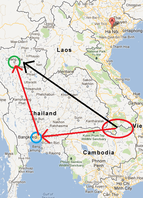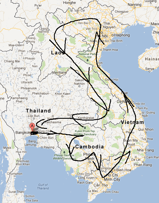 נחתתי בתאילנד (הגעתי מסרי לנקה) ואז נסעתי לצפון תאילנד, משם עברתי ללאוס בסירה, טיילתי בלאוס דרומה,עברתי לקמבודיה,עליתי צפונה בויאטנם, ומהנוי טסתי בחזרה לתאילנד, והייתי בדרום תאילנד (אם תסתכל על המפה זה יראה הגיוני)
