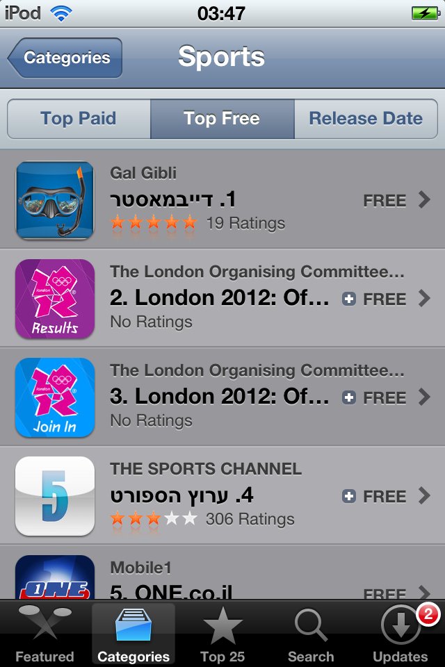 מקום ראשון באפליקציות החינמיות בקטגורית "ספורט" ב Appstore