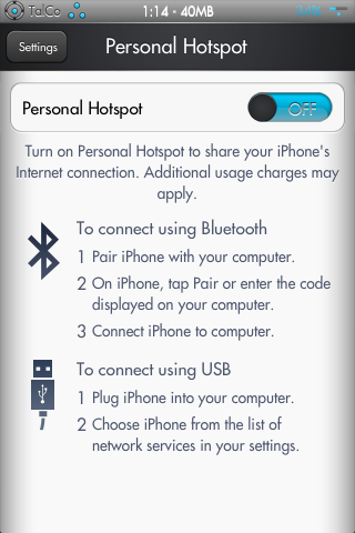 שלום לכולם, שהייתי בסלקום ושאחי היה בפלאפון היה אפשרי לשים סיסמה בנקודת גישה אישית ובנוסף הייתה אפשרות לשתף את האינטרנט בלי כבל או שימוש בבלוטוט'. האם הדבר אפשרי גם בהוט מובייל?