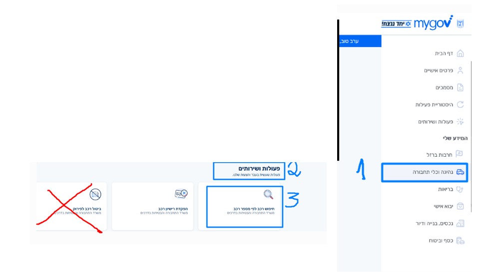 "ניתן לקבל אישור על ביטול הרכב: ב"נהיגה וכלי תחבורה", בכפתור "חיפוש רכב לפי מספר רכב", יש למלא את מספר הרכב המבוטל ולבצע חיפוש"