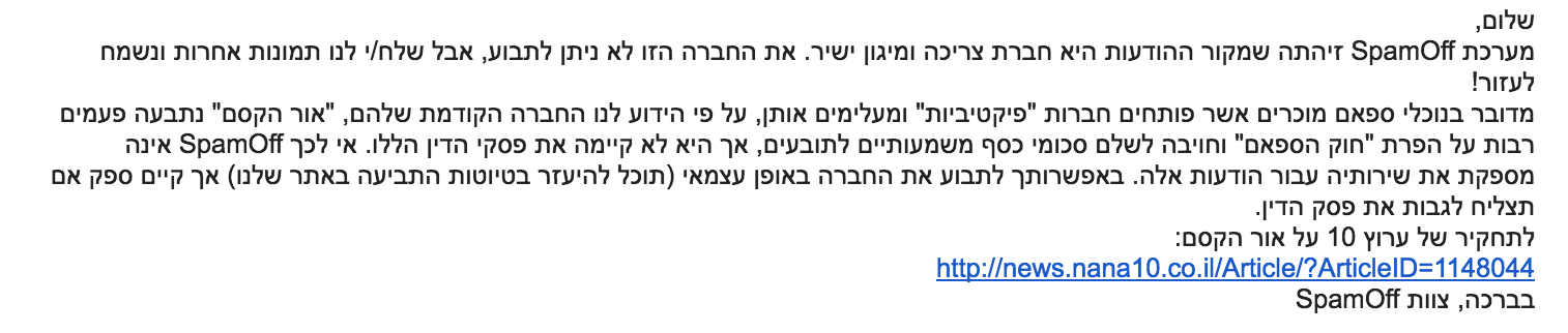 מדובר על הודעות של אור הקסם / צריכה ומיגון ישיר. מדובר על נוכלי ספאם שפותחים וסוגרים חברות כמו פטריות אחרי הגשם. אתה תגיש תביעה, אתה גם תזכה בה. אבל אין לך סיכוי לראות את הכסף. כמות התיקים נגד החברה ונגד בעליה ארוכה יותר מספר טלפונים ועדיין לא הצליחו לסגור אותם.