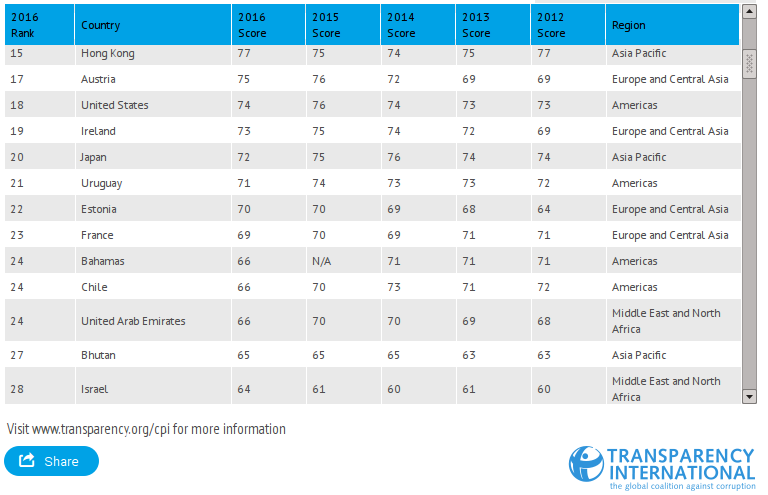 אינדקס השחיתות 2016 - ישראל מקום 28
