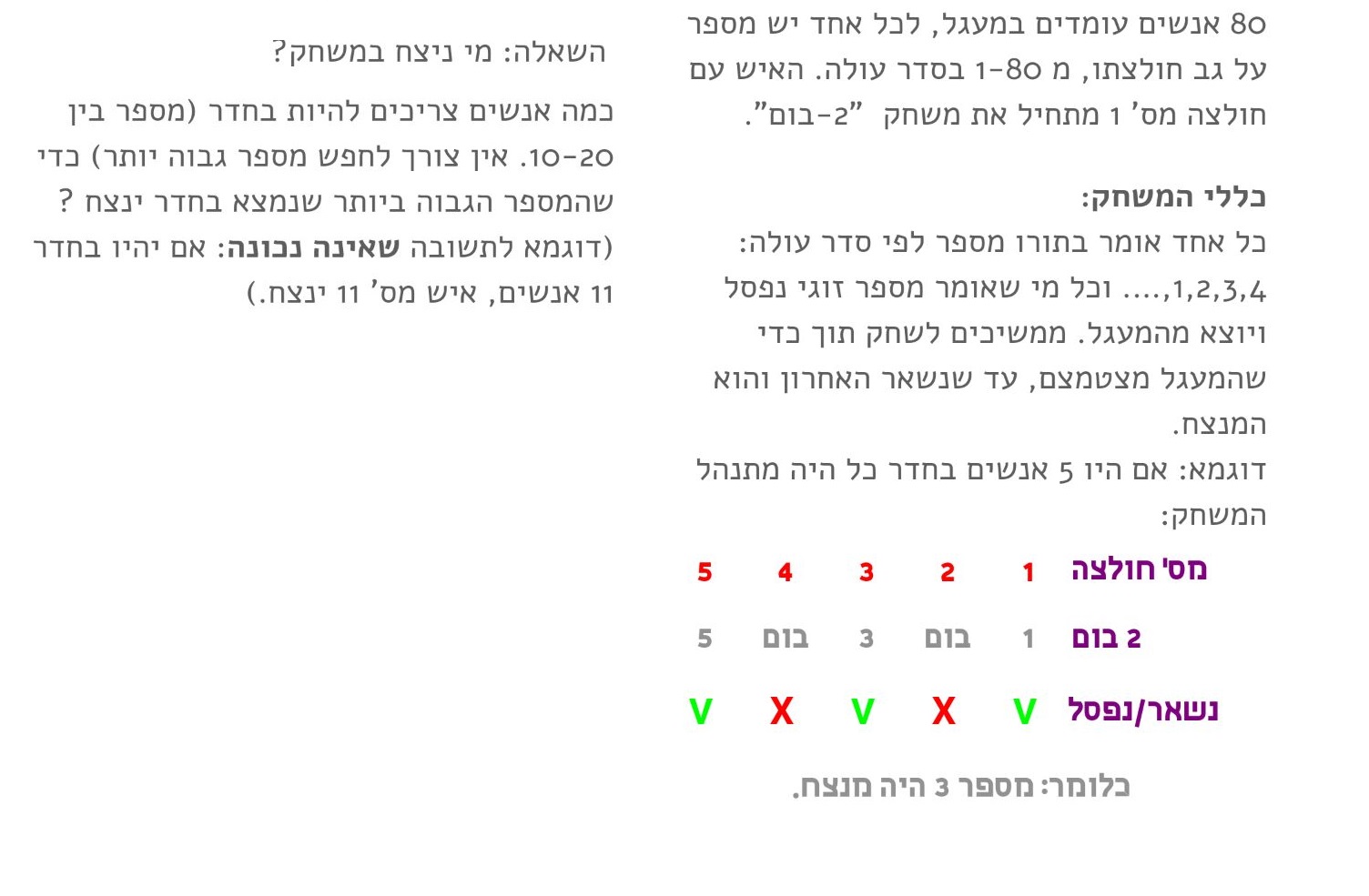 בסיבוב הראשון יורדים כל הזוגיים ונשארים 40 איש 1 3 5 7 9 ...... 77 79 בסיבוב השני נשארים 20 איש ושוב מתחילים מהראשון 1 5 9 ........77 בסיבוב השלישי נשארים 10 אנשים 1 9 17 ..... 73 בסיבוב הרביעי נשארים 5 אנשים 1 17 33 49 65 וכמו בדוגמא למעלה השלישי מנצח כלומר נשאר 33