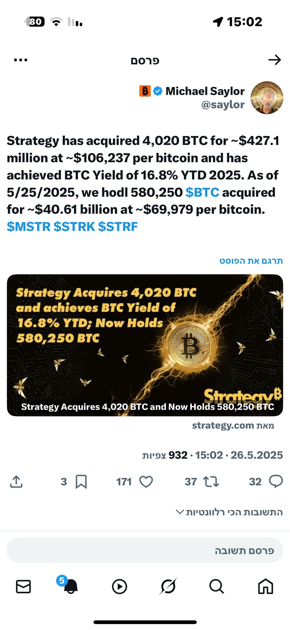 "גם השבוע, כמעט כמו כל שבוע MSTR קונה ביטקווין.הפעם 4020 בשער של 106,237"