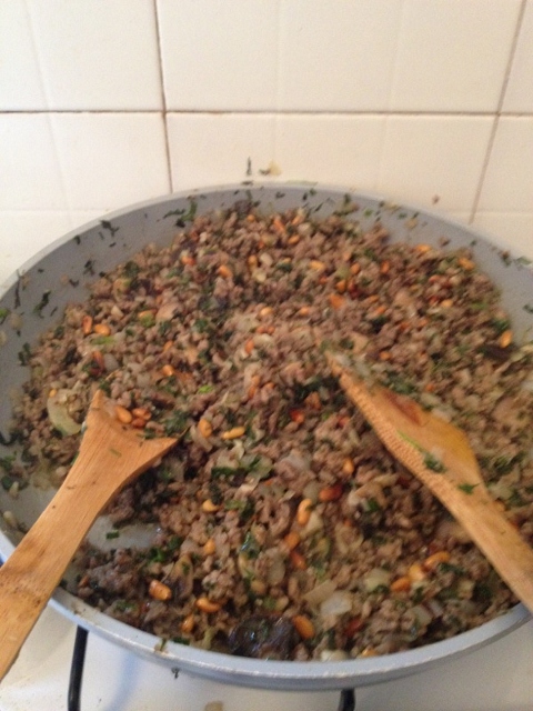 בתפריט:לחמניות ממולאות בבשר שהקצב טחן עבורי(200 אנטריקוט, 200 פילה עגל, 200 כבש ו50 שומן כבש), פטריות, בצל, עירית, נענע, שמיר, פטרוליזיה, מלח, פלפל, פלפל כבוש, תבלין טרגון, קצת כמון, צנוברים קלויים..
