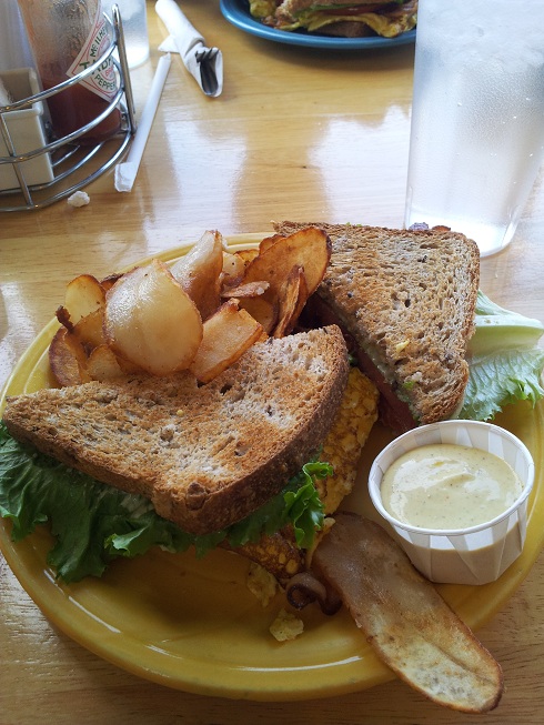 שבועיים של אכילה לא נפסקת של ג'אנקפוד אמיתי...אז לנשנוש קל היה לנו כריך מגניב של ירקות, בשר וביצה עם ציפסים אפויים בצד...