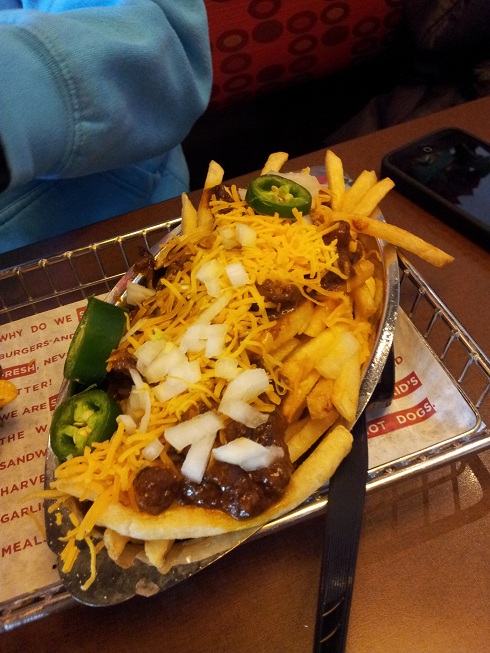 צ'יפס עם תבשיל צ'ילי וגבינה מגורדת.