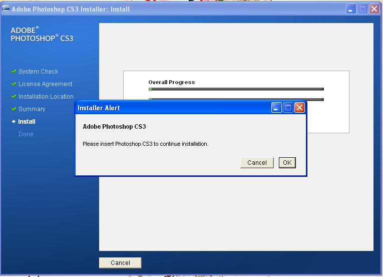 שאני מתקין את הפוטושופ אז יש את השלב של ה-install אחרי כל השלבים הראשונים ואז שאני מגיע לשלב הזה הוא אומר לי משהו כזה.. please insert phohtoshop CS3 for countinue instalation