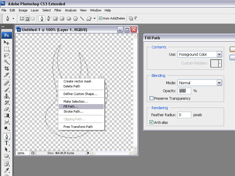 נוודא שהצבע הקדמי שלנו הוא שחור. כעת נלחץ קליק ימני עם ה- Pen Tool על המסמך ונבחר ב Fill Path. שימו לב שהuse צריך להיות על foreground,כלומר הצבע הקדמי שבחרנו - שחור. נלחץ Ok.