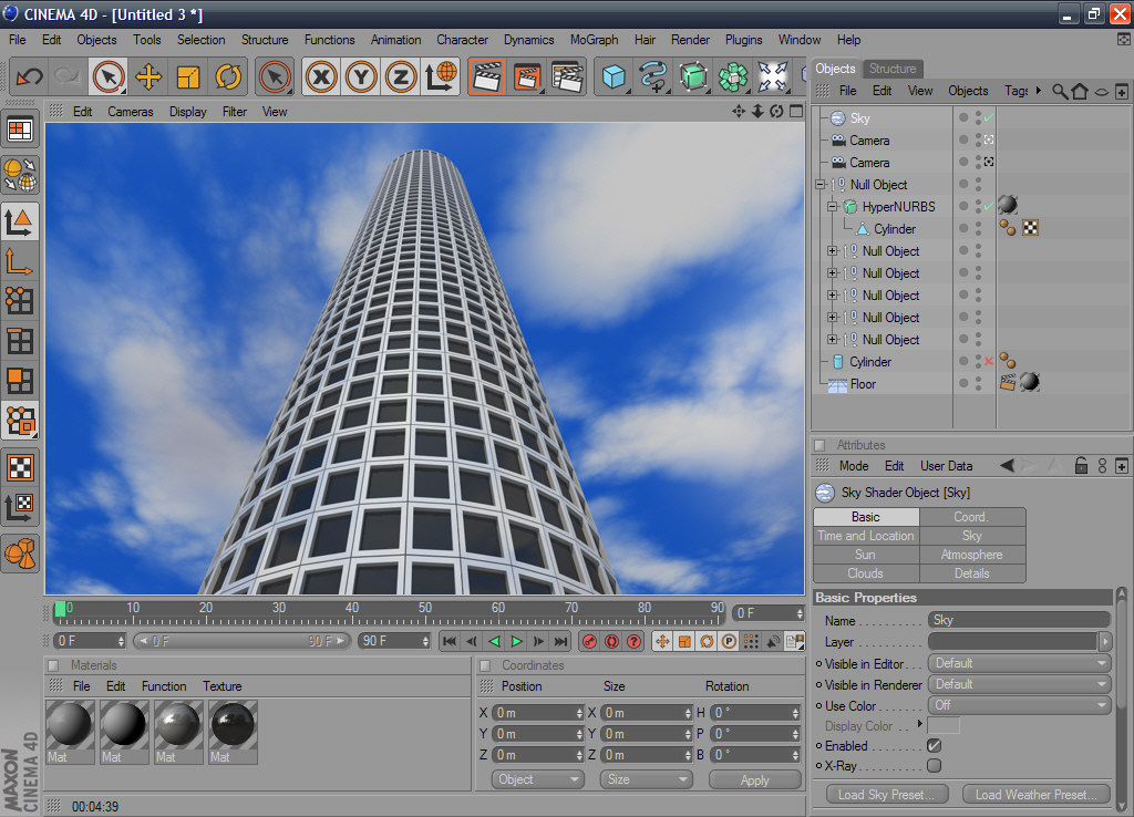 מטריאל עם קצת השתקפות ושקיפות לא הכנסתי תאורה, אלא השתמשתי בשכבת שמיים (Objects => Sky => Create Sky) ומשם כבר הגדרתי את מבנה העננים, עוצמת וצבע השמש וכו...