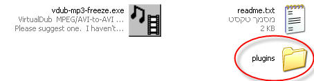 כנסו אל התיקייה שאליה פרסתם את VirtualDub, תיצרו בה תיקיה בשם plugins ובתוכנה שימו את הקובץ textsub.vdf שהורדתם: