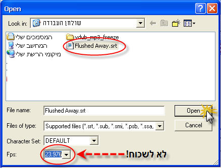 עכשיו בחרו את התרגום של הסרט, וחלק התחתון של החלון בחרו את הFps שרשמתם לכם מקודם, ולחצו על "Open":