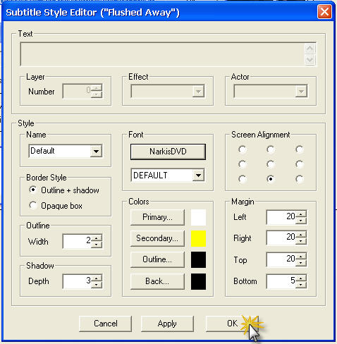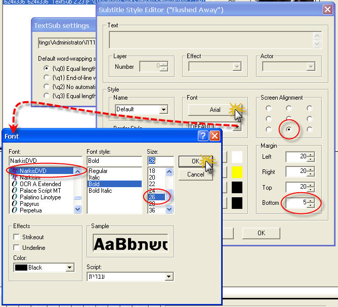לחצו על הכפתור שרשום בו "Arial" ובחרו במקומו את הפונט NarkisDVD, ובגודל בחרו 24 עד 28. (לא יותר- זה סתם יעלים חלק מהתרגום).